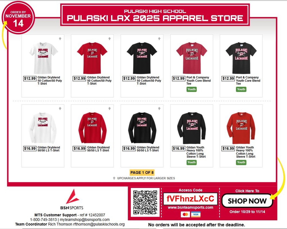 Attached is the online Pulaski HS Boys Lacrosse Team Store 2025 details including store link and access code below.